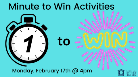 Stop by the Youth Services department to try out some thrilling and fun, Minute to Win It games. The premise is simple: just complete either of the tasks in less than a minute to win (we'll have a small prize at the Youth Desk, if you do). Today, we'll try our hands at two different games.