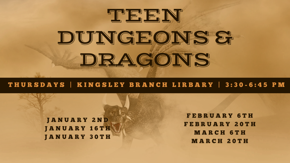 Image of a dragon on a tan background, text overlay reads "teen dungeons and dragons."